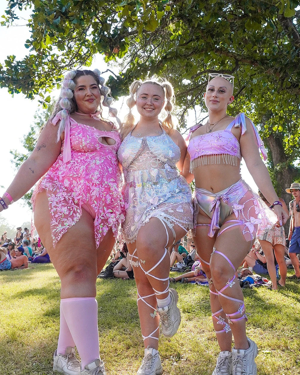 Live the butterfly life with the Chrysalis Holo Butterfly Patches Leg Wraps. Featuring baby pink ribbons that wrap around ur legs and fancy, iridescent butterfly patches, these wraps will make u dance around in in dazzling technicolor.