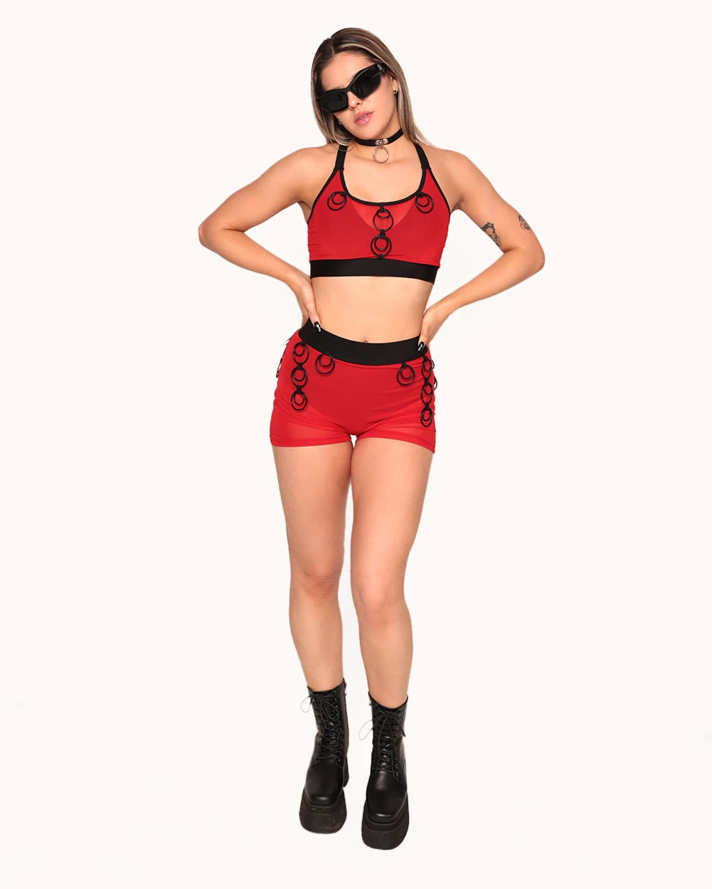 Step into a whole new realm wearing the ClarissaTalks x iHR Enter the Portal Ultra Crop Top! This fiery red ensemble features sheer mesh construction and bold o-ring accents that add a daring edge to your look.