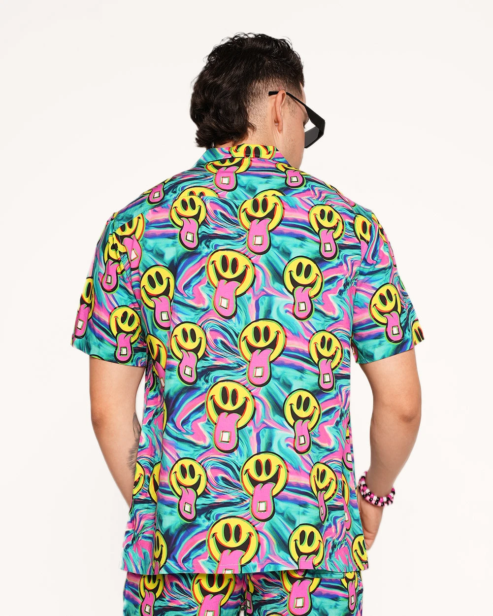 Put on the Happy Hour Camp Shirt and instantly feel the night come alive! With our iconic acid smileys all over this top, you’re sure to steal the scene and immerse yourself in pure bliss.