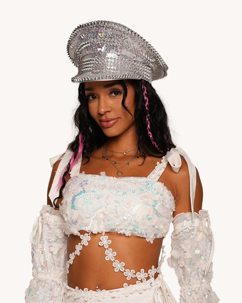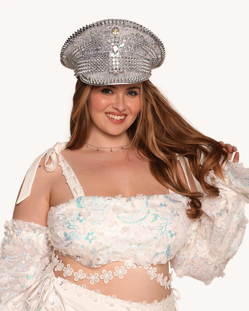 Float through the festival grounds like a celestial dream! The Heaven’s Forever Floral Shoulder Tie Top with Sleeves shimmers with iridescent sequins, delicate floral details, and ethereal off-the-shoulder sleeves. Tie up and glow like the rave goddess you are!