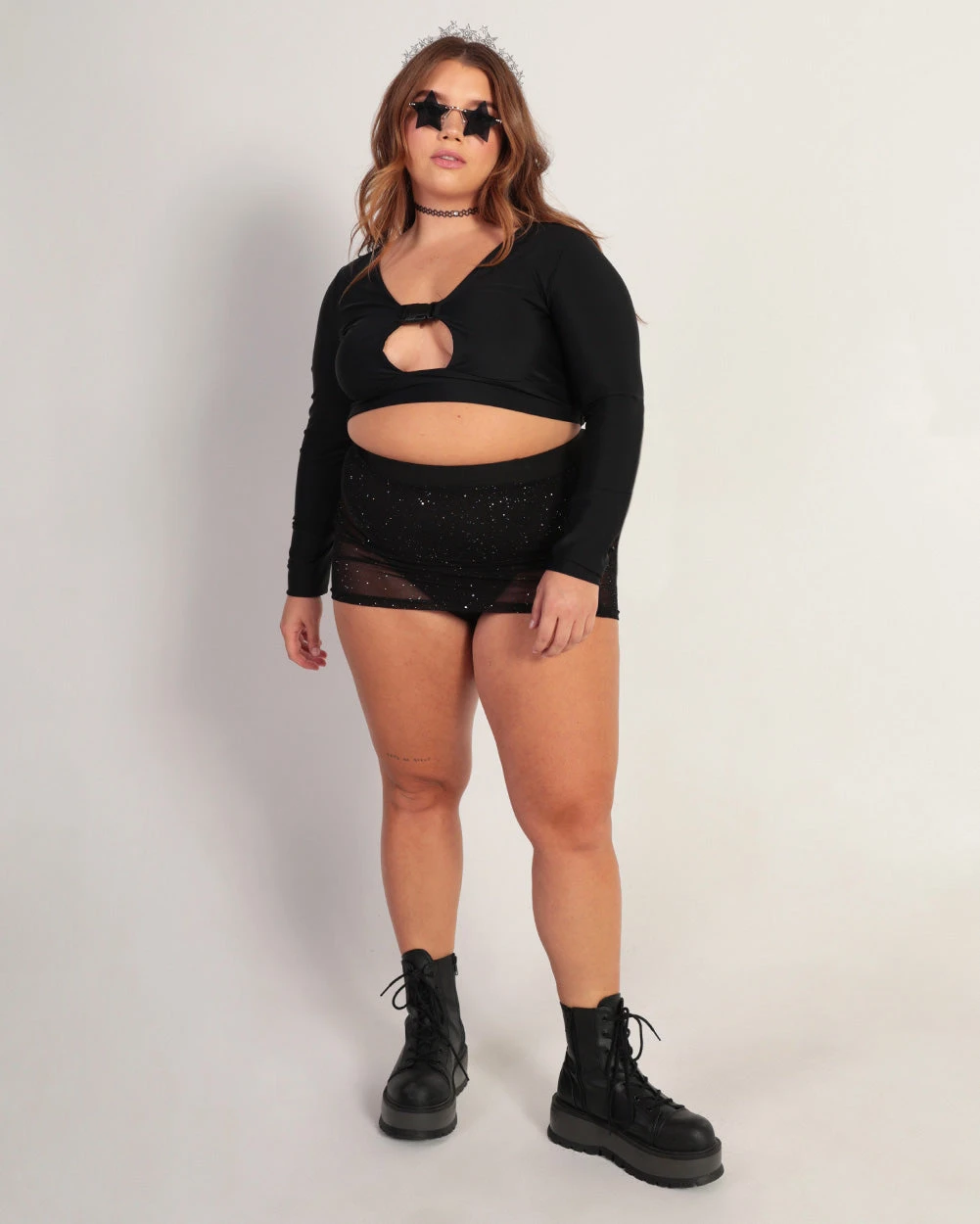They can’t handle how hot you’re gonna look in our Holo Star Mini Skirt. The stars shine just for you in this black mesh rave skirt that features a black sheer with holographic star fabric, soft & stretchy elastic waistband with a moderately cheeky fit.