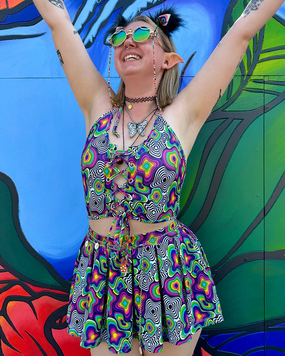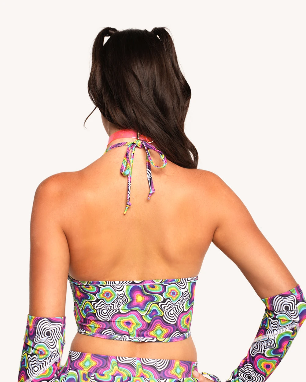 Slip into the Leblunt x iHR Love Vortex Top with Sleeves and let the vibes pull you deeper! This top is a full-body frequency shift—channeling radiant PLUR energy with every trippy twist of color. Featuring a hypnotic rainbow print, a lace-up corset design, and a plunging halter neckline.