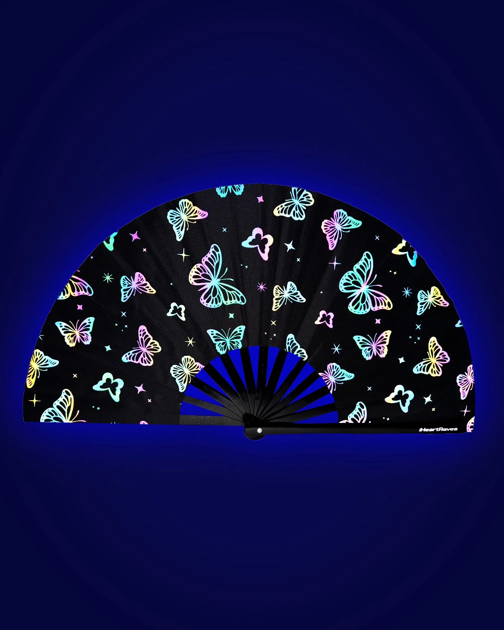 Float through your next weekend bender with the Lucid Flight Rainbow Reflective Hand Fan! This mesmerizing rave essential features neon-hued butterflies that come to life under the lights, creating a trippy, iridescent glow.