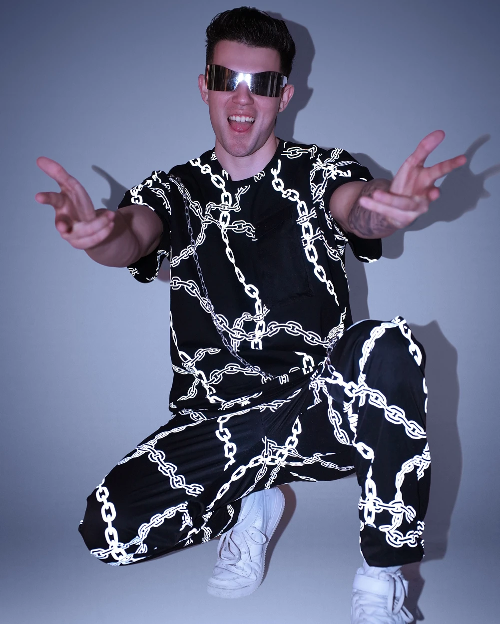 Charge up and electrify the night in the Power Surge Silver Reflective Chain Men’s Tee! Wrapped in a web of chains and pulsing with rainbow-reflective energy, this men’s rave top is pure power in motion. Under the lights, it flashes like a lightning strike—unpredictable, unstoppable, and impossible to ignore.
