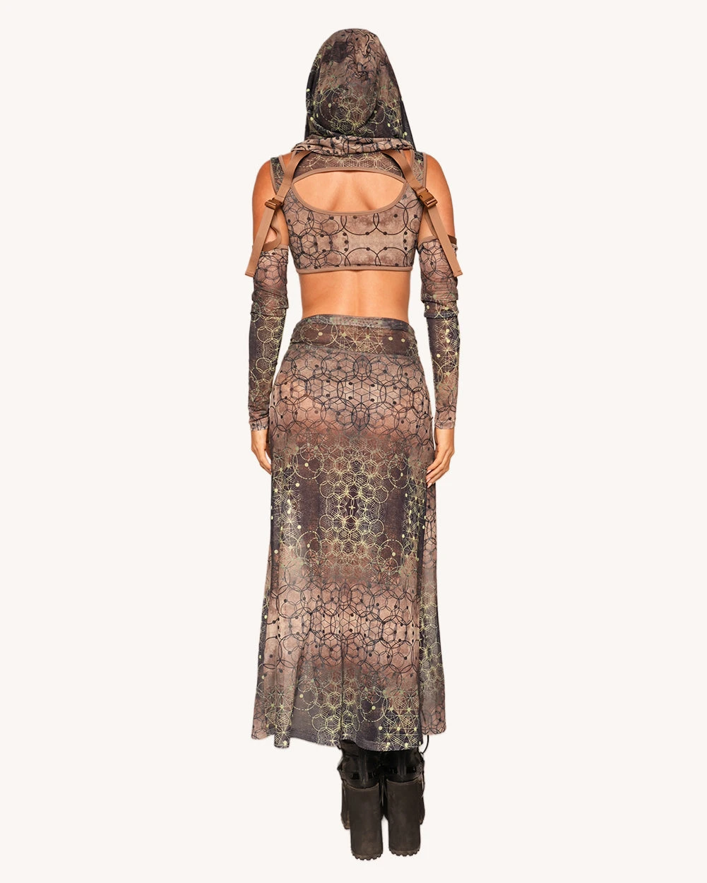 Step into the wild and awaken your most untamed self in the Raptor’s Wake Dress. This flowy, high-slit maxi dress is made from dreamy mesh with a glitchy earth-toned fractal print that hits like bass in your chest. Designed for movement, mystery, and major main stage moments.
