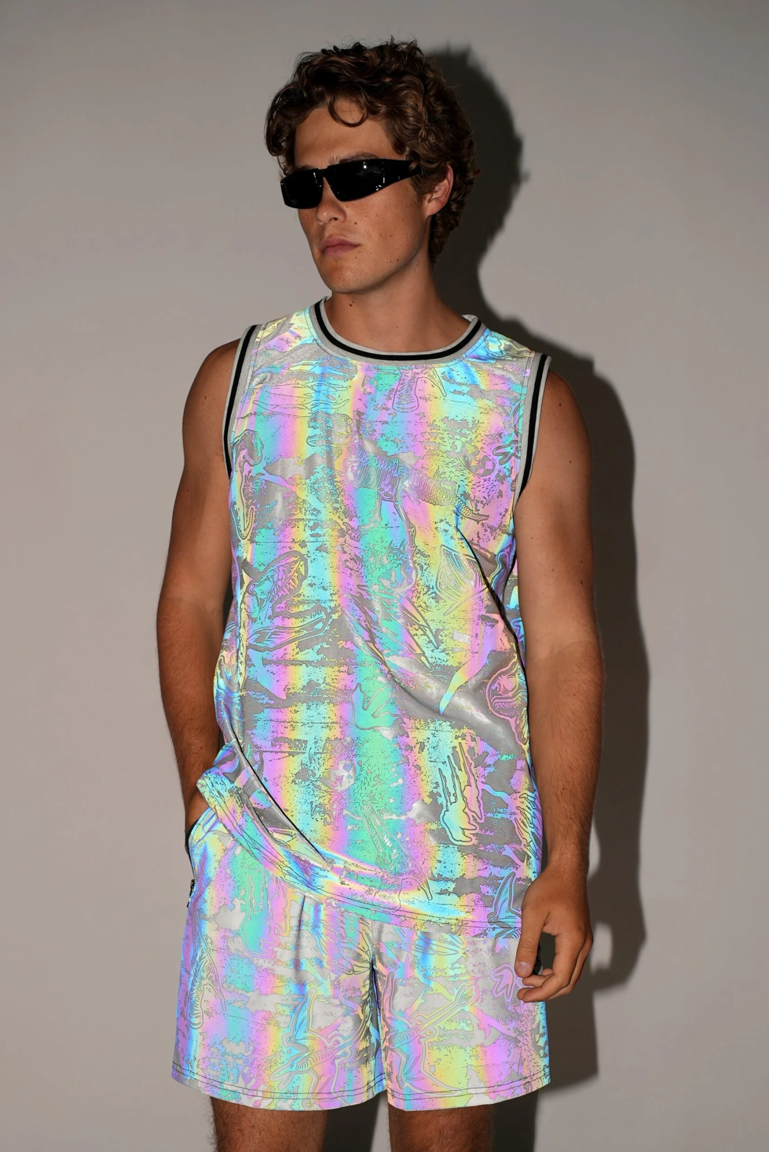 The Reckless Men’s Reflective Jersey is your go-to gear for the land before time! Designed to reflect the chaos, this unisex top features a comfortable fit and a trippy all-over dino print that lights up under flash and stage lights.