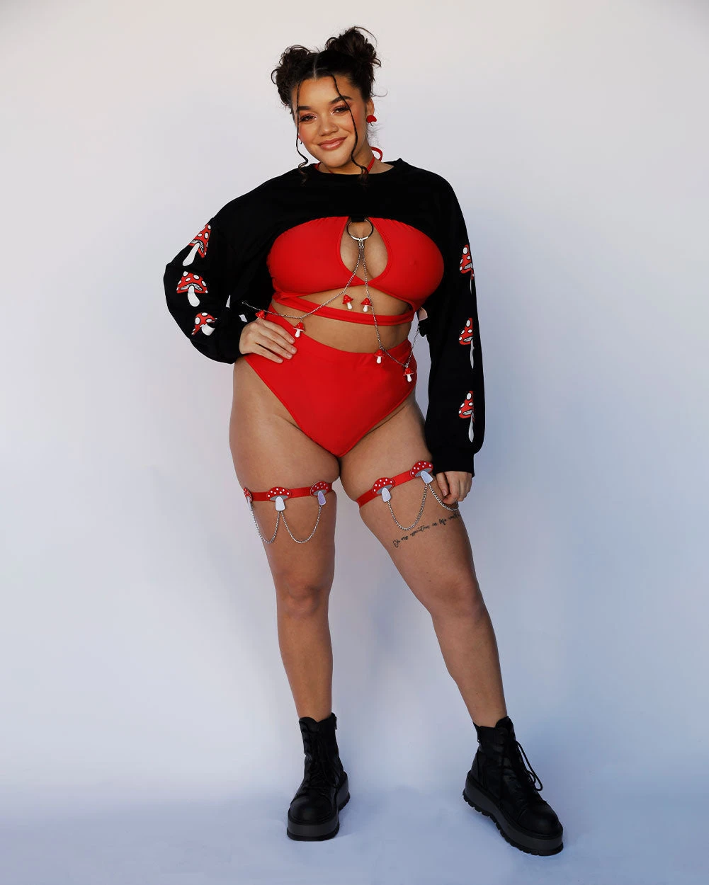 Keep the trippy vibes going with the Shroomy Chain Leg Garters! Wear this with a daring skirt, shorts, or a whimsical festival outfit to elevate your style game.