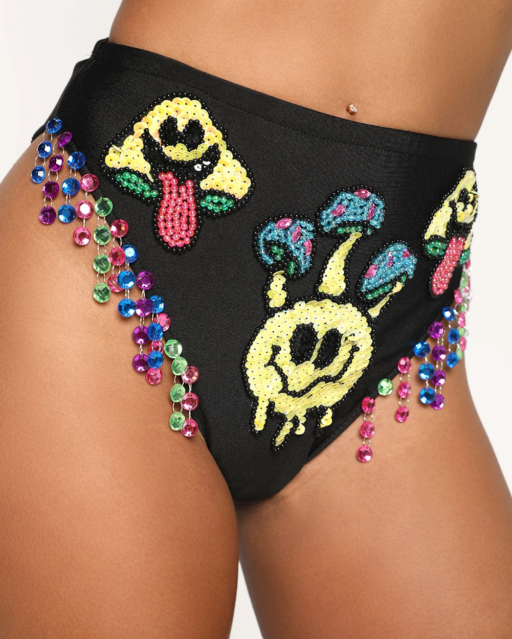 It’s colorful vibes and good times with the Tripp Out Carnival Bottoms! With our iconic acid smileys supersized into charms and neon rhinestone chains, these rave bottoms are definitely a head-turner.