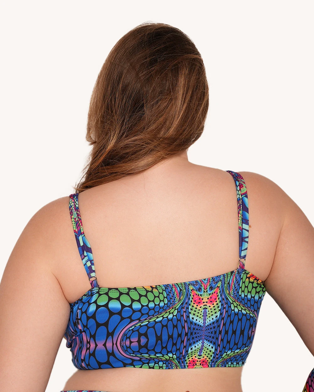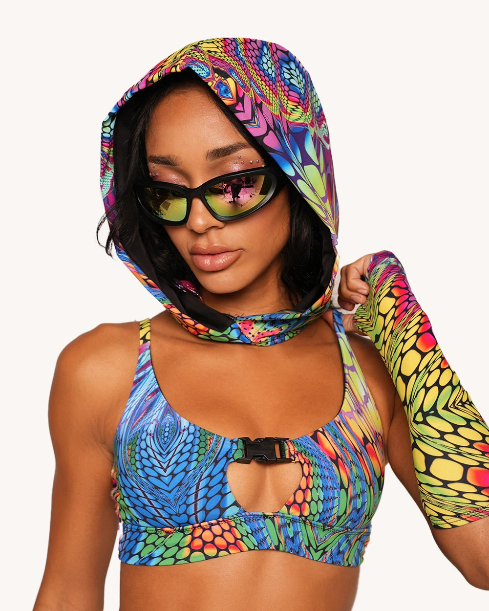 Slither into the spotlight with our Viper Vision Recycled Fabric Speed Clasp Crop Top! This trippy masterpiece is designed to captivate and mesmerize, with its figure-flattering fit and enchanting reflective viper print. Total bass stage baddie energy!